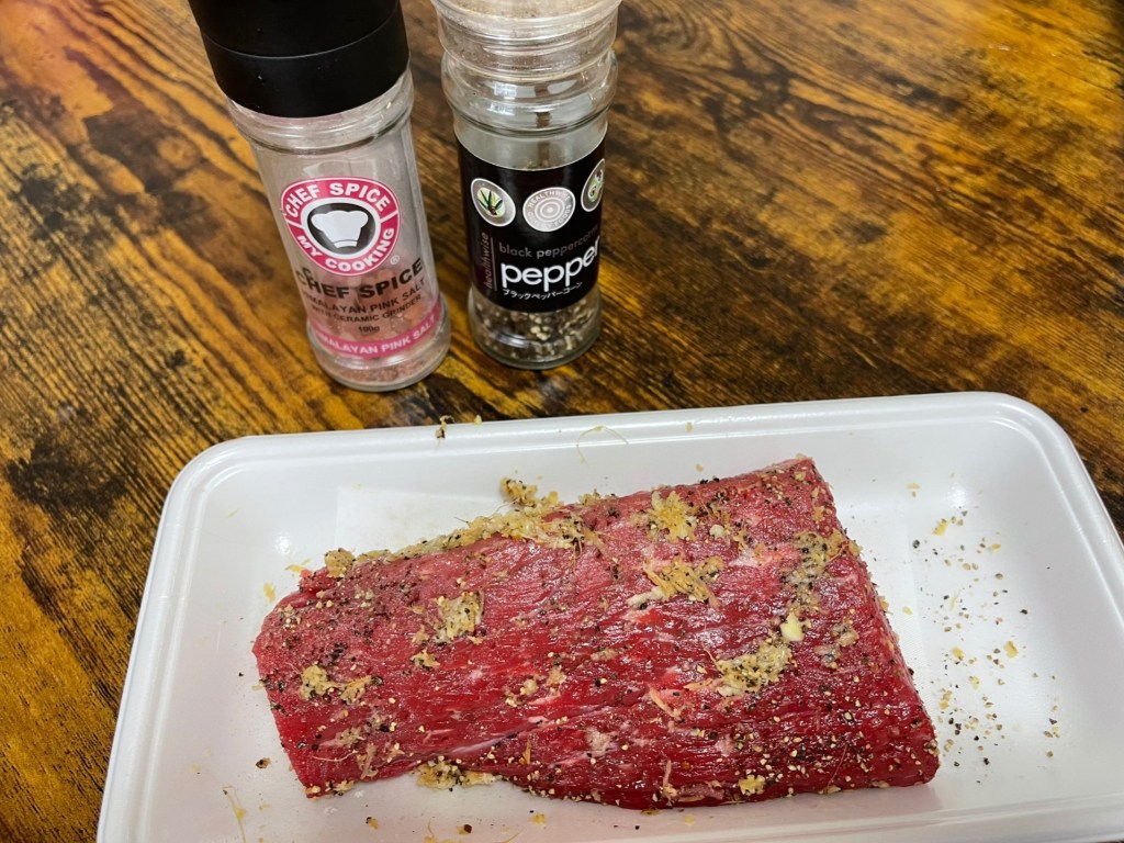 ①牛もも肉に、塩、胡椒、すりおろした生姜、ニンニクをお肉に擦り込む(ˊૢᵕˋૢ)